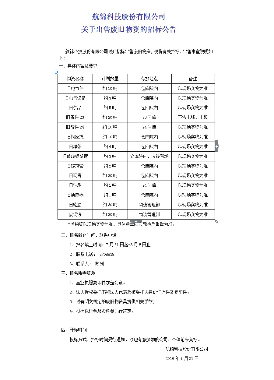 航锦科技股份有限公司关于出售废旧物资的招标公告