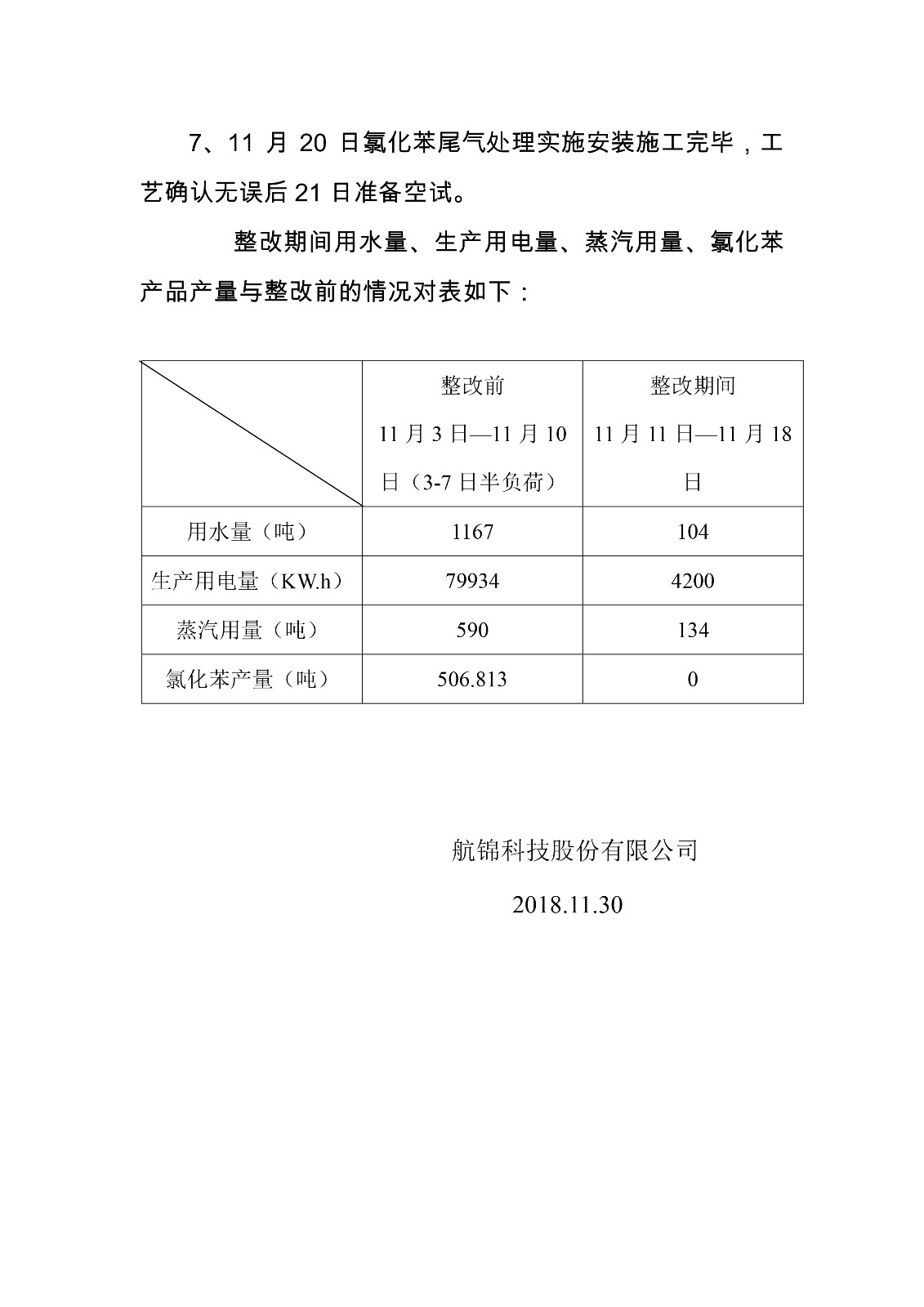 航锦科技股份有限公司氯化苯停产整治完成情况的报告